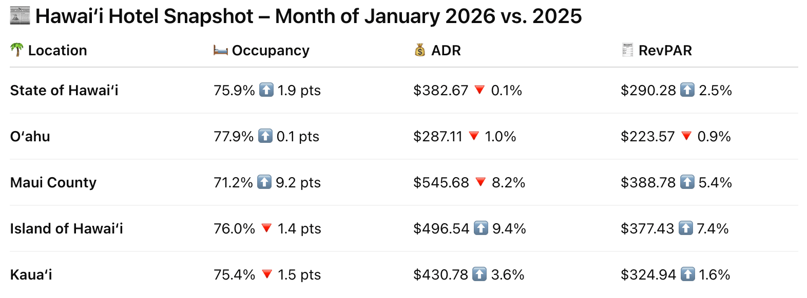 Quick Summary (So You Sound Smart in Meetings): Demand is slightly up statewide, with the rate flat. Maui filled more rooms by cutting the rate. Hawaiʻi Island pushed rate and won (7.4% rev par growth!) Oʻahu is steady but uninspiring. Net result: modest RevPAR growth (2.5%), no breakout story.